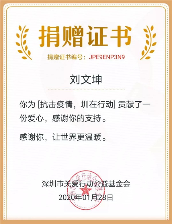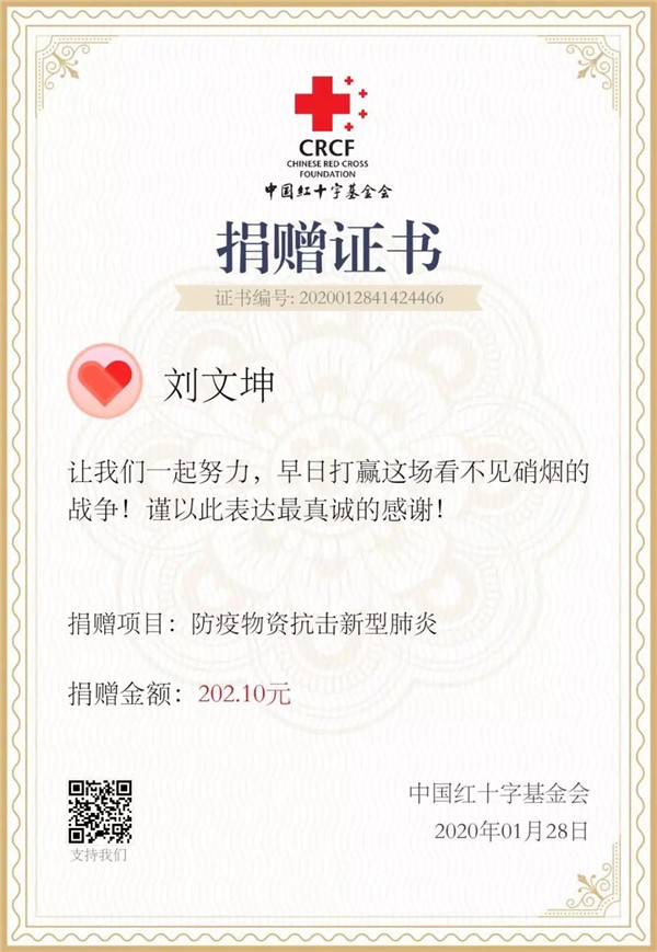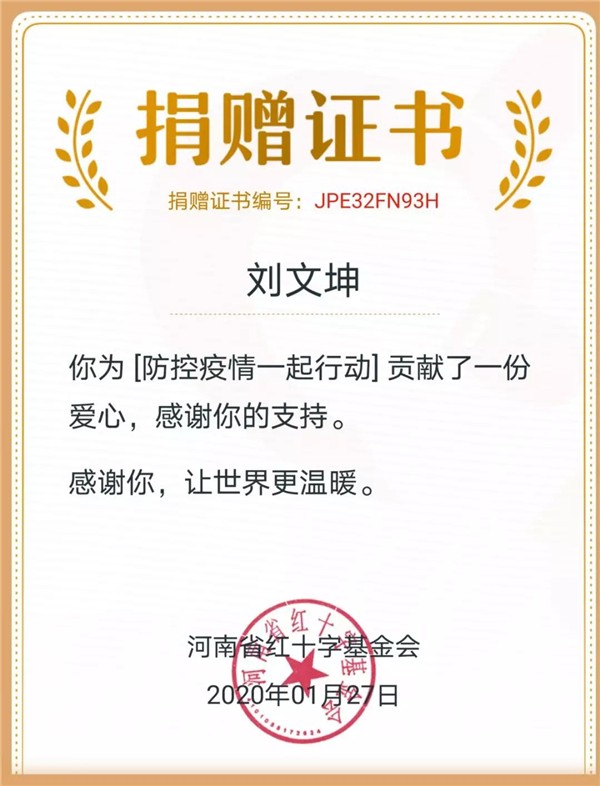 面對(duì)突如其來(lái)的疫情,劉文坤同學(xué)作為一名天航學(xué)子,更作為一名學(xué)生干部時(shí)刻心系湖北,希望聚沙成塔,盡綿薄之力,為打贏這場(chǎng)疫情防控戰(zhàn),貢獻(xiàn)天府新區(qū)航空旅游職業(yè)學(xué)院大學(xué)生的一份力量。最后,劉文坤同學(xué)獲得了中國(guó)紅十字基金會(huì)、河南省紅十字基金會(huì)、深圳市關(guān)愛(ài)行動(dòng)公益基金會(huì)等官方組織頒發(fā)的證書(shū)。