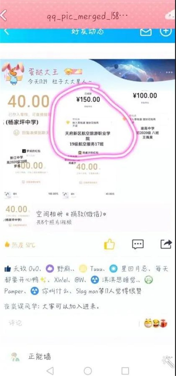 2020年1月28日至1月29日為期兩天,我們共籌集善款882.8元,捐贈人有我院的學(xué)生,她們是來自19級民航運輸10班的姜思佳、18級民航運輸6班的彭思琪、18級民航運輸5班的魏星園、18級民航運輸6班的王陽、19級航空服務(wù)20班的王菁、19級航空服務(wù)20班的徐菲、19級航空服務(wù)20班的李帛益、19級航空服務(wù)22班的康賢芝,還有四川和天津的一些愛心人士。我相信,只要我們中國人團結(jié)一心,共同努力,互相幫助,萬眾一心,我們一定能打贏這場防疫阻擊戰(zhàn)!