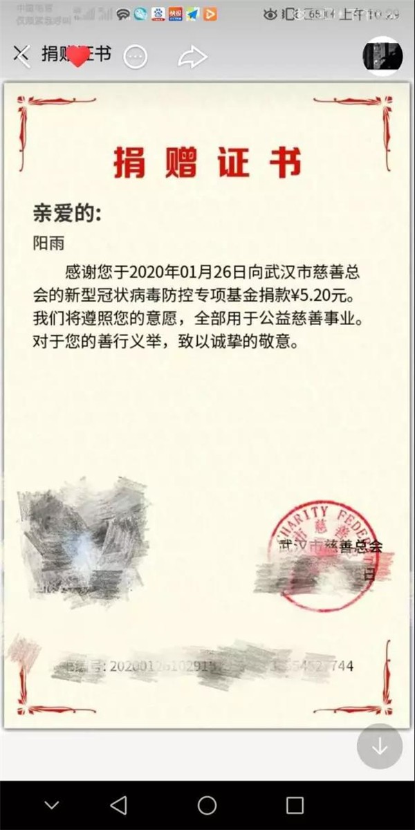 抗疫期間,作為學(xué)生的我最好方式就是待在家里,不給國家添亂。我在微信公益項目看到抗疫捐款公益活動,我就捐了50元。