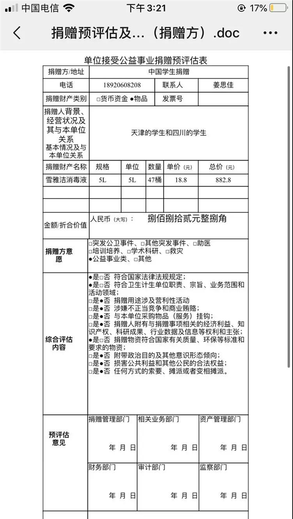 我是天津人,當(dāng)我得知疫情爆發(fā)的那一刻,我就時刻關(guān)注著有關(guān)疫情的所有新聞,全國人民一起努力支援武漢,所有物資供應(yīng)武漢,后來得知江蘇省無錫市人民醫(yī)院也非常缺乏物資,我也想做一點事情盡一點微薄之力,于是我就組織身邊的朋友進行捐贈物資的募捐活動,很感謝我院18級民航運輸6班的彭思琪同學(xué)的幫助,和我一起完成此次捐贈。