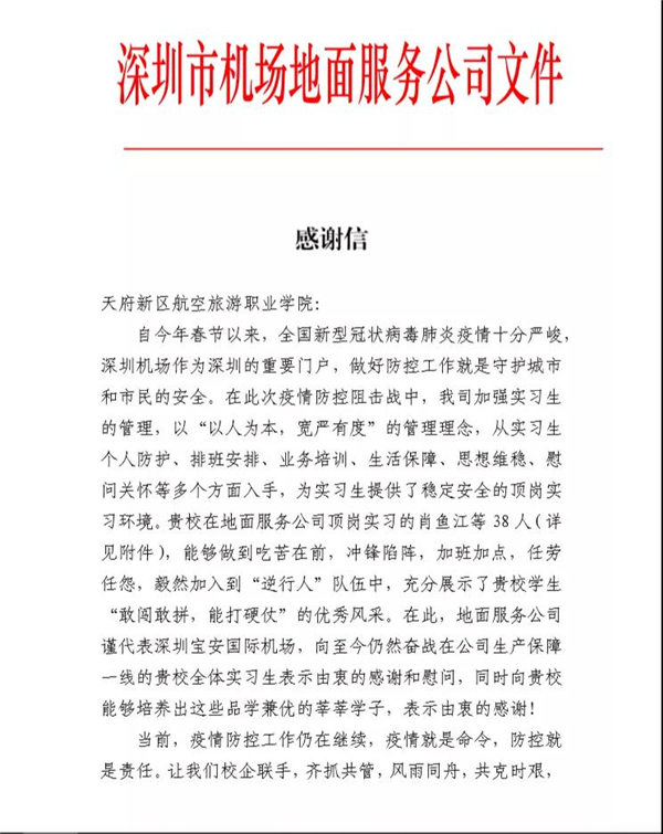 近日,我院收到了一封來(lái)自深圳市機(jī)場(chǎng)地面服務(wù)公司的感謝信,信中說(shuō),深圳機(jī)場(chǎng)作為深圳的重要門(mén)戶,做好防控工作就是守護(hù)城市和市民的安全。在此次疫情防控阻擊戰(zhàn)中,貴校在地面服務(wù)公司頂崗實(shí)習(xí)的肖魚(yú)江等38人,沖鋒陷陣,加班加點(diǎn),任勞任怨,毅然加入到“逆行人”隊(duì)伍中,充分展示了貴校學(xué)生“敢闖敢拼,能打硬仗”的優(yōu)秀風(fēng)采。