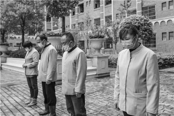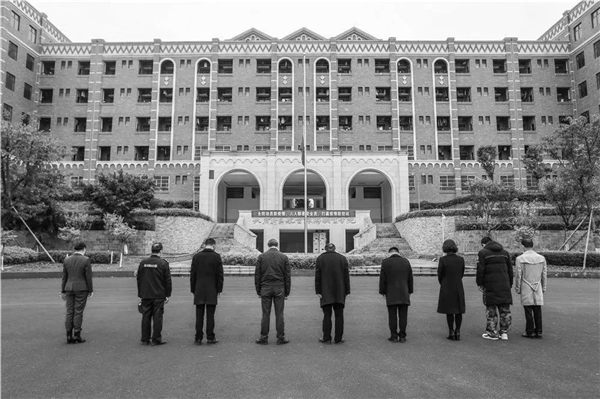 教職工們眼眶泛紅,沉默良久,“疫情新聞不敢過多地看,因為看一次哭一次?!彼麄冊谄鞐U前雙手合十祈禱,有人在旗桿前鞠躬。