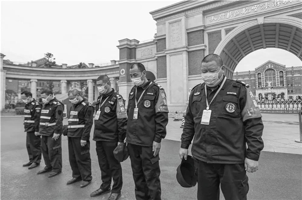 “嗚……嗚……”上午10時,防空警報拉響,鮮艷的五星紅旗緩緩下降至距離旗桿1/3的位置,堅守崗位的天府航院值班教職工聚集在國旗下,神情凝重,默然肅立,為犧牲的烈士和逝世同胞默哀3分鐘。這一刻時間靜止,這一刻舉國同悲!為逝者哀悼,向犧牲的英雄致敬。