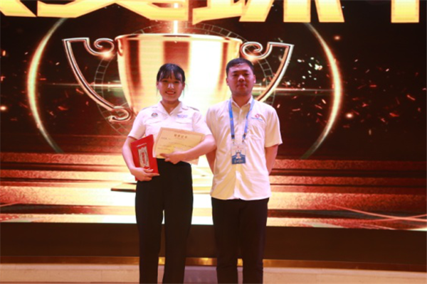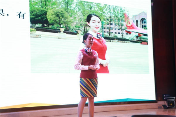 2019級空乘5班的張瀝尹同學(xué)圖文并茂、生動形象的講解四川火鍋,憑借精湛的講解獲得主持人大賽季軍,學(xué)院團委副書記石慧為她頒獎。