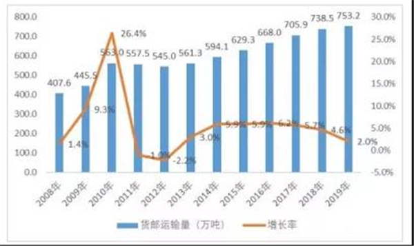 圖表4:2008-2019年民航貨郵運(yùn)輸量及增長率分析