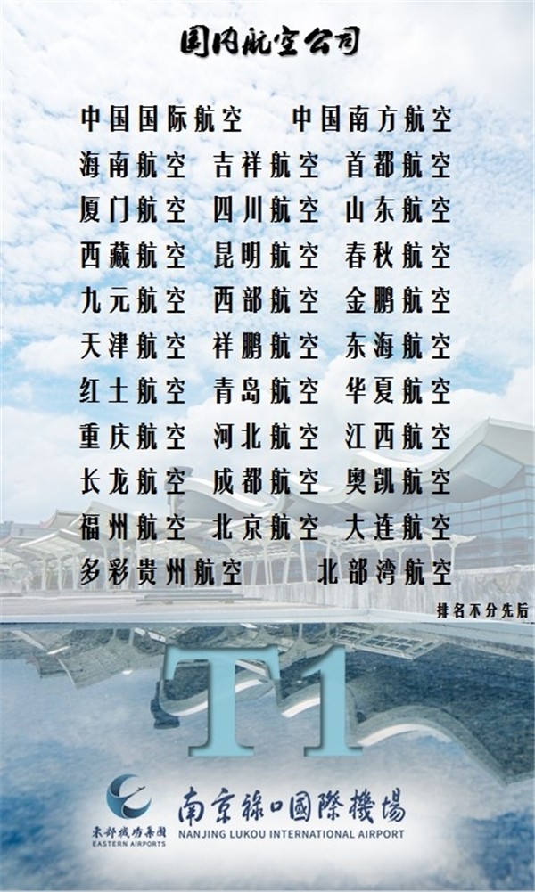 7月30日起,南京祿口機(jī)場(chǎng)所有航班按照下圖T1、T2現(xiàn)有的航空公司(航班實(shí)際承運(yùn)人)分配方案執(zhí)行: