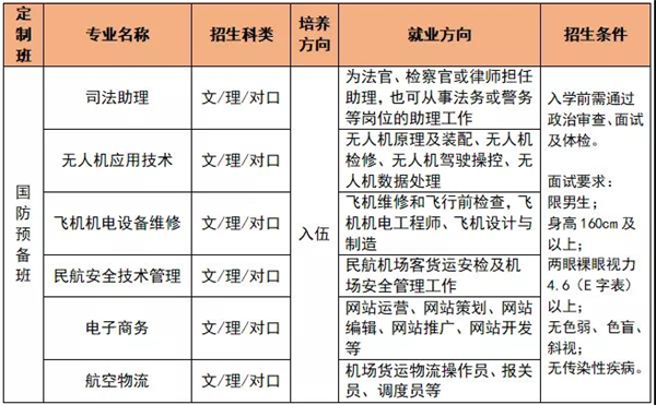 我院國(guó)防預(yù)備班有六大專業(yè)可選,實(shí)行單獨(dú)編班制,參照部隊(duì)營(yíng)連管理模式,采取嚴(yán)格的軍事化管理,統(tǒng)一著裝,在校集中食宿,在完成國(guó)家規(guī)定的全日制大專課程基礎(chǔ)上,開(kāi)展國(guó)防教育、軍事體育等特色教育訓(xùn)練。學(xué)生入學(xué)前需要進(jìn)行政治審查、面試及體檢,合格后即可入學(xué)。學(xué)生在大二學(xué)年結(jié)束后,參加武裝部軍檢及政治考核合格后到部隊(duì)服役,畢業(yè)后主要以參軍入伍為主,也可選擇學(xué)院推薦就業(yè)。