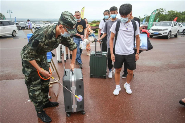 校門(mén)外彩球高懸,鮮艷的氣球拱門(mén)上寫(xiě)有“天府新區(qū)航空旅游職業(yè)學(xué)院歡迎您”,顯得喜氣洋洋。面對(duì)蜂擁而至的新生們,安檢、防疫工作人員早已準(zhǔn)備就緒,對(duì)每一位進(jìn)入校園的新生進(jìn)行行李消毒、身份確認(rèn)、健康碼、以及核酸檢測(cè)報(bào)告查驗(yàn),隨后進(jìn)入測(cè)溫專用通道,依次排隊(duì)走過(guò)熱成像測(cè)溫儀,登記信息,全方位落實(shí)防控要求,確保師生健康安全。