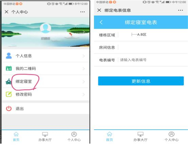 第三步 進(jìn)入系統(tǒng)以后點(diǎn)擊個(gè)人中心,綁定寢室先選樓棟信息(6#雄鷹樓、8#金鵬樓、9#飛燕樓、10#孔雀樓),其次樓層,再選區(qū)域(ABCD)