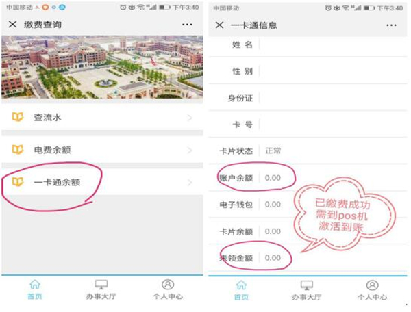 第五步:到寢室樓下圈存機(jī)或者到財(cái)務(wù)處9號(hào)窗口的機(jī)器激活