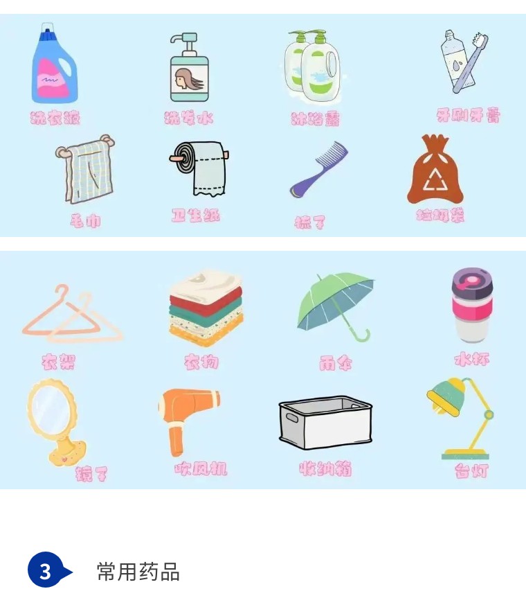 鏡子、梳子、指甲鉗、衛(wèi)生紙、水杯、衣架、粘鉤、雨傘、小鎖頭、針線盒、毛巾、洗衣液、肥皂、插排、吹風機(特別提醒:功率一定要在800W以下?。。。┻€有一些洗漱化妝的用品也記得準備上。
