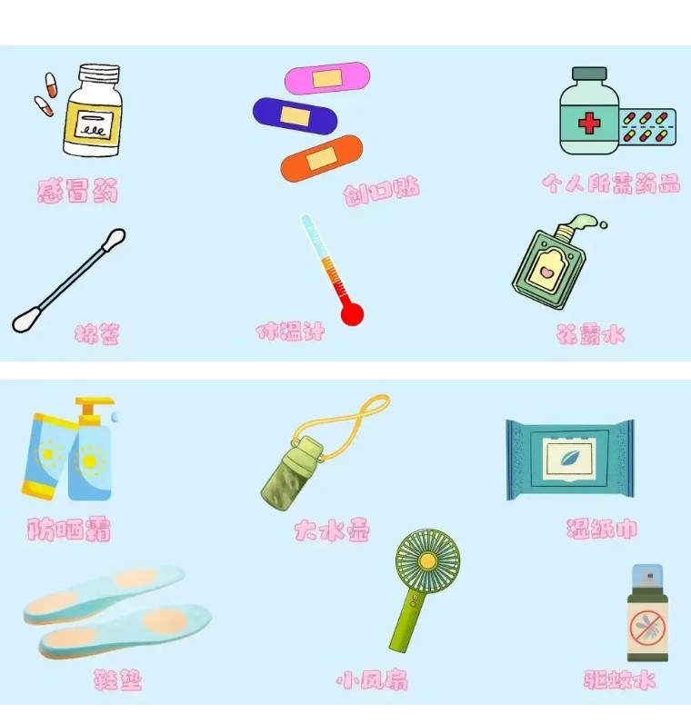 準備好一些常見的醫(yī)藥品,比如感冒藥、退燒藥、防暑藥物、止瀉藥、碘酒、創(chuàng)口貼、醫(yī)用棉簽、跌打損傷藥等。
