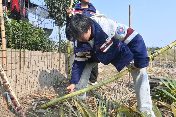 勞動(dòng)過(guò)程中,師生黨員熱情飽滿、分工有序。田間地頭,有的黨員揮鐮砍蔗,有的整理捆扎,有的負(fù)責(zé)搬運(yùn),大家配合默契、干勁十足。盡管冬日微寒,但勞動(dòng)現(xiàn)場(chǎng)氣氛熱烈,汗水與笑容交融,展現(xiàn)出不怕苦、不怕累的踏實(shí)作風(fēng),豐收的喜悅洋溢在每個(gè)人的臉上。勞動(dòng)間隙,還組織了輕松有趣的“偷甘蔗”互動(dòng)游戲,師生積極參與,現(xiàn)場(chǎng)歡聲笑語(yǔ)不斷。大家手持親手收割的甘蔗合影留念,記錄下這次充實(shí)而有意義的實(shí)踐時(shí)刻。