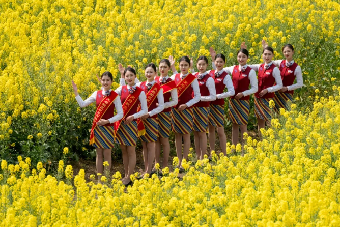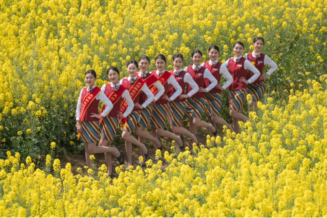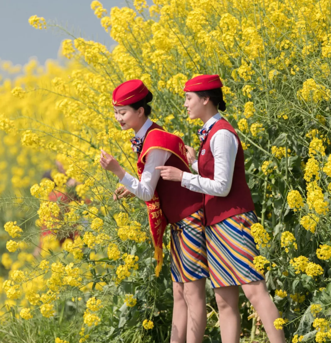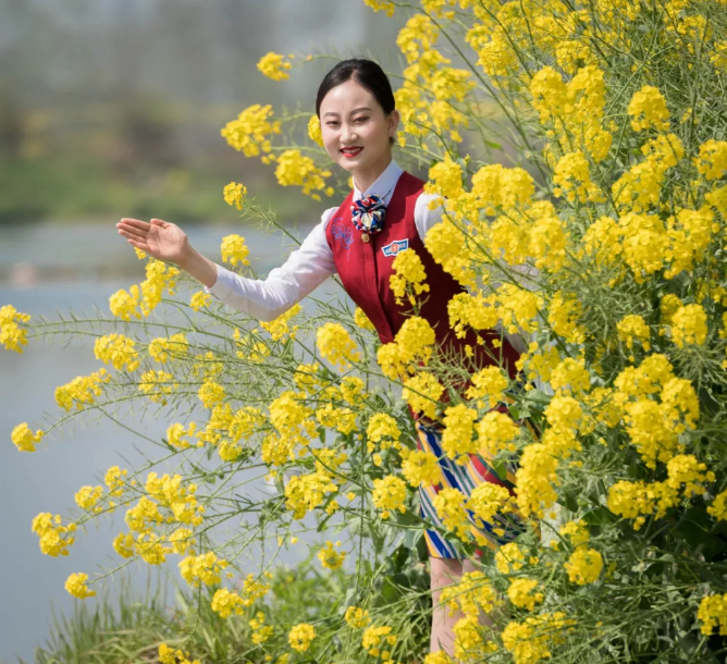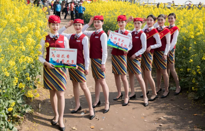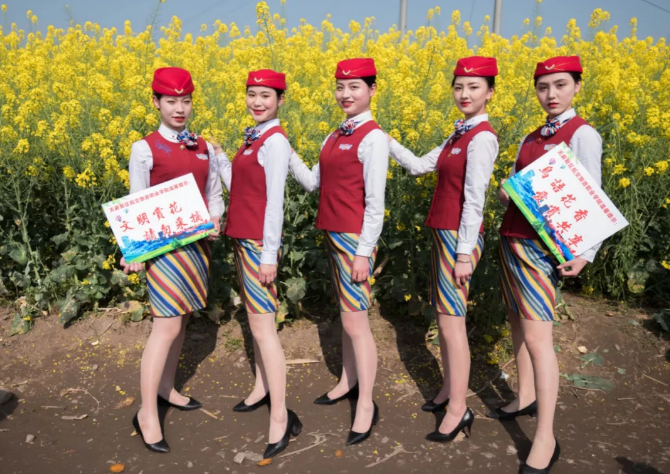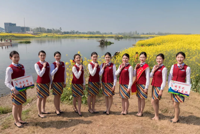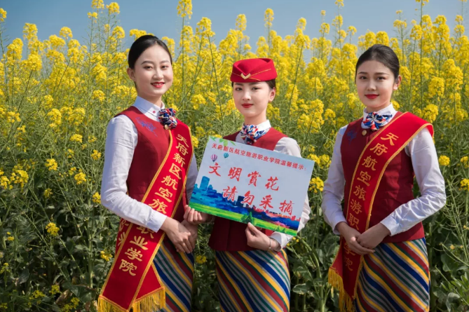 在這個(gè)油菜花霸屏的季節(jié),春意正濃的蓮花村油菜花競相開放,成為市民踏青的打卡圣地,花海叢中人頭攢動(dòng),聞花香忙自拍。為避免游客采摘及踩壞農(nóng)田莊稼,天府新區(qū)航空旅游職業(yè)學(xué)院的準(zhǔn)空姐們,自發(fā)地加入到勸導(dǎo)者隊(duì)伍,并手舉書寫文明賞花的紙牌,勸導(dǎo)游客文明賞花。