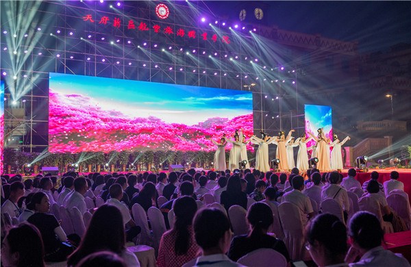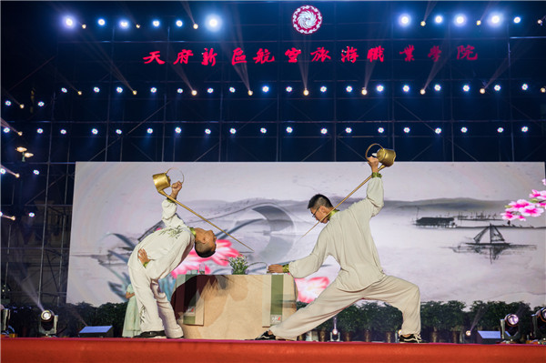 賽事期間,與會領(lǐng)導(dǎo)、老師和同學(xué)在天航體育場觀摩了由天府新區(qū)航空旅游職業(yè)學(xué)院組織的“迎接祖國70華誕,擁抱職業(yè)教育春天”主題文藝晚會。