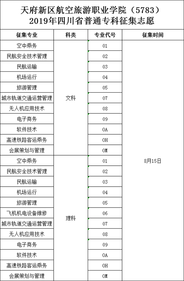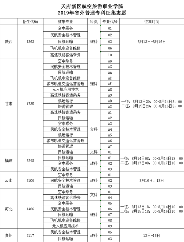 天府新區(qū)航空旅游職業(yè)學(xué)院2019年??婆谝淮握骷驹?,征集條件:未被其它學(xué)校錄取,且分?jǐn)?shù)達(dá)到省控線150分。具體征集專業(yè)如下:
