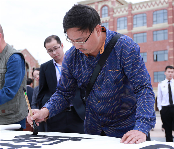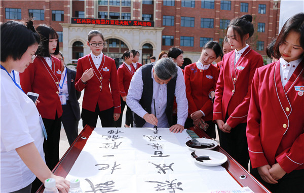 到場的書畫藝術(shù)家們就在現(xiàn)場揮毫潑墨,仁壽書畫院院長李覺悟現(xiàn)場潑墨“他山之石,可以攻玉”送給天航。他說道:“書畫進校園活動既可以提升學(xué)校文化品位,也是為文化家們提供一個采風(fēng)的文化載體。書法是我們國家的國粹,希望通過這樣的活動,培養(yǎng)同學(xué)們良好的書法藝術(shù)興趣。”