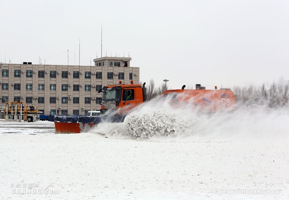 由于持續(xù)降雪,清雪隊(duì)員采取雪下即掃、邊下邊清、反復(fù)清理、及時(shí)拉運(yùn)的方式組織調(diào)配機(jī)械設(shè)備,并合理避開航班高峰,利用航班間隙,集中20臺(tái)主力掃雪車同時(shí)對(duì)跑道、滑行道進(jìn)行清掃,確保機(jī)場(chǎng)的暢通。