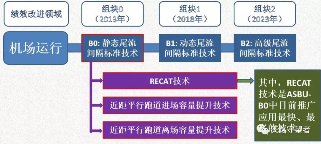 ICAO于2012年發(fā)布的ASBU機(jī)場運(yùn)行引線中,給出了在三個(gè)組塊/時(shí)間節(jié)點(diǎn)下的尾流間隔模塊,明確提出了縮減尾流間隔的“三步走”計(jì)劃,RECAT則是第一步(WAKE-B0)的重要組成部分。