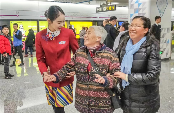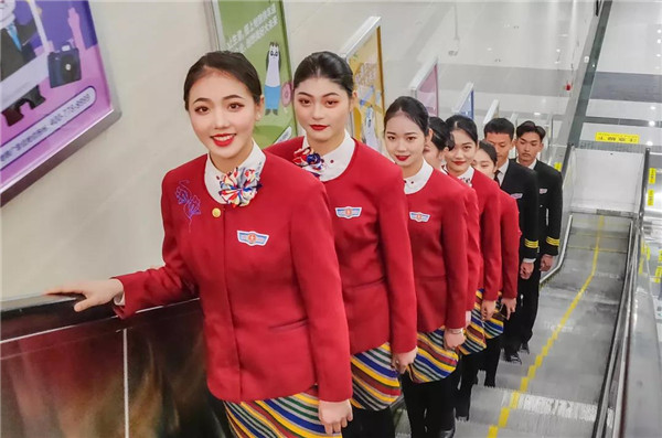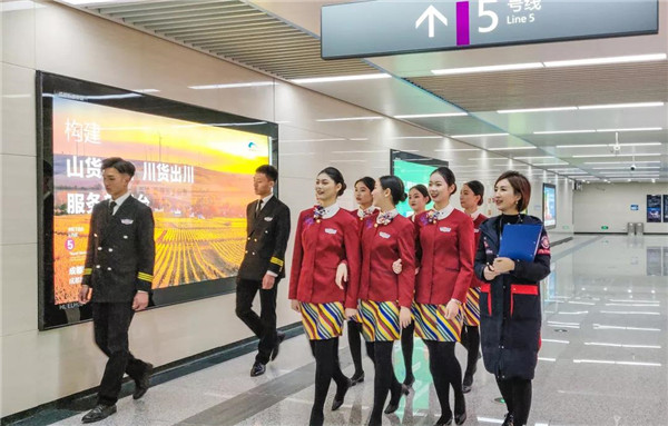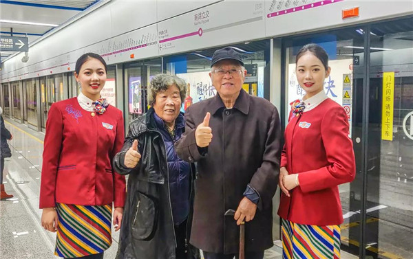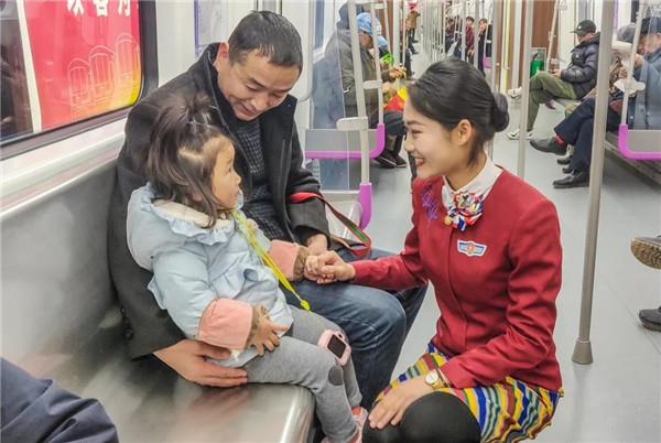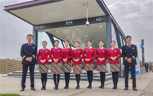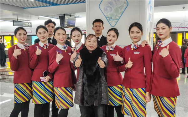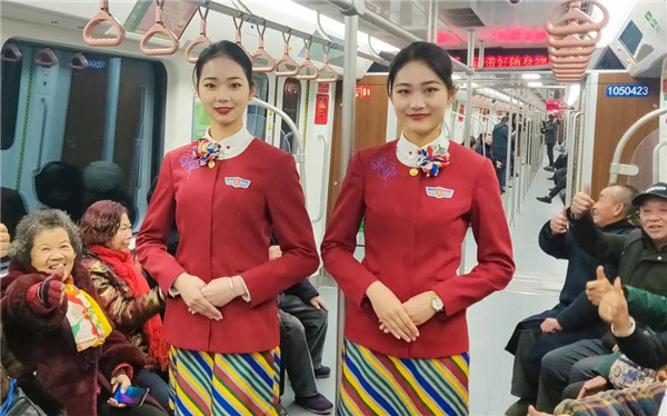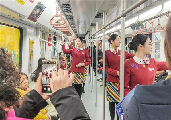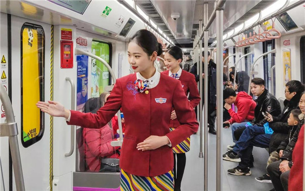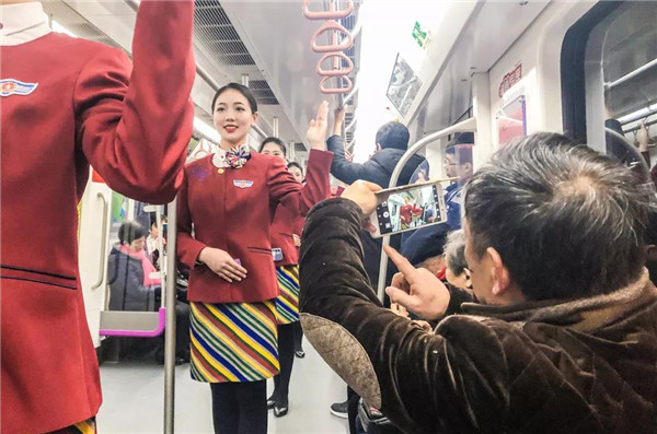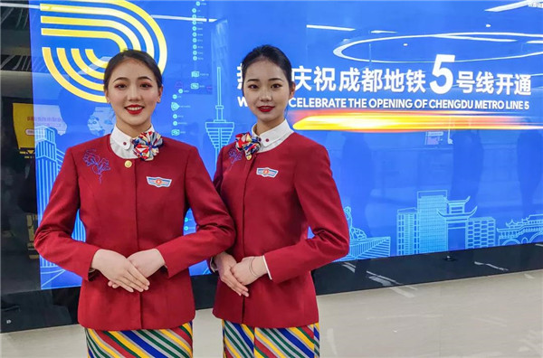 來(lái)川旅游的孫女士很驚訝:“5號(hào)線檔次高哦,乘務(wù)員都換成空姐了?!币灿胁簧俪丝头Q贊:“這些女娃兒長(zhǎng)得好乖,漂亮又有氣質(zhì),在地鐵體驗(yàn)到坐飛機(jī)的感覺(jué),這一趟真心值!”空姐們的一顰一笑、舉手投足知性典雅、高挑嫵媚的身材,引來(lái)不少乘客圍觀欣賞,有熱情的更是搭訕求合影。