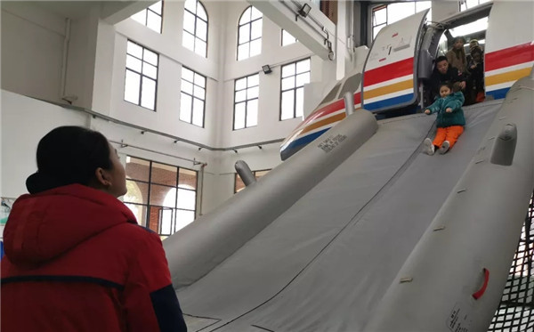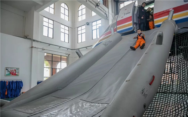 “起飛了,飛向藍天了!”小朋友們在A320動態(tài)模擬艙內(nèi),感受真實飛機的起飛、顛簸和陸地、海上迫降等姿態(tài)。隨后通過熱身訓(xùn)練,在講解員的示范中學(xué)會規(guī)范的逃生動作,掌握逃生姿勢,進行高空緊急撤離體驗。不少小朋友從滑梯滑下來的一刻喊道,“真是太刺激了,我還想再玩一次!”