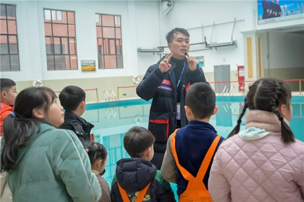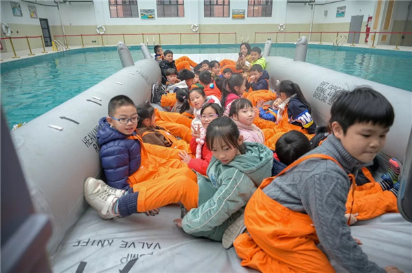 在水上訓(xùn)練室的A320/A330出口模擬器前,小朋友們在老師的指導(dǎo)下有序的從艙門撤離到水面救生艇上。實訓(xùn)中心老師為小朋友們講解了飛機在水上迫降后的撤離技能、海上求生技巧、游泳技能等,通過理論和實操演示學(xué)習(xí),培養(yǎng)小朋友一定的團結(jié)協(xié)作意識、求生意識和求生技能。